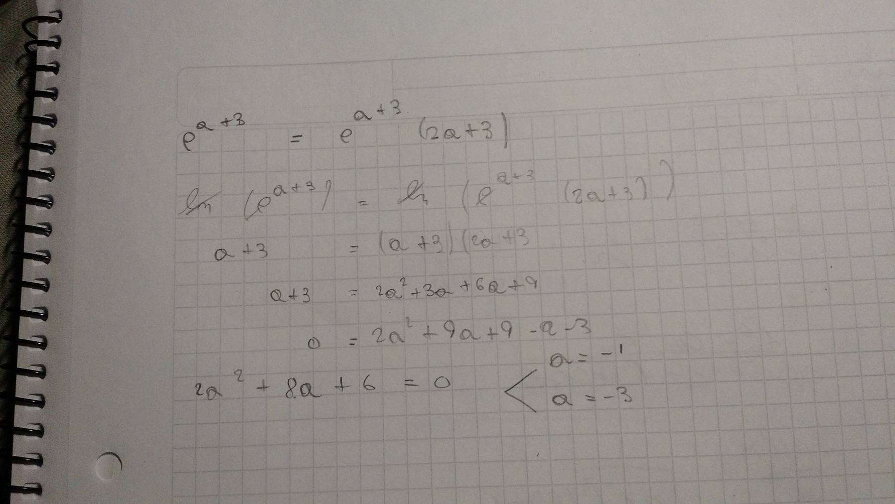 e^(a+3)=(e^(a+3))(2a+3)-->e^(a+3)-(e^(a+3))(2a+3)=0-->Ahora Factorizamos-->e^(a+3)(1-(2a+3))=0