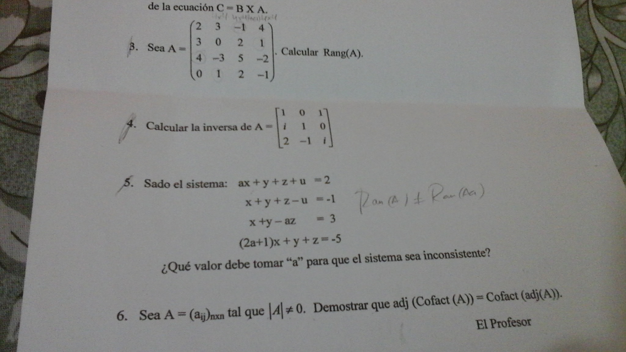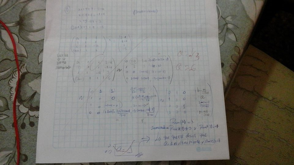 Esta bien David, hice este avance, lo envio, sin embargo la respuesta es otra( a=-1/3 y a=6) ,bueno a mi me salio a=1, ( lo hice con matriz aumentada, para hallar los rangos(GAUSS), y la teoria dice que el rango de los coeficientes tiene que ser diferente a rango de la matriz aumentada para que sea inconsistente o incompatible)... en que falle??....gracias por el consejo :)