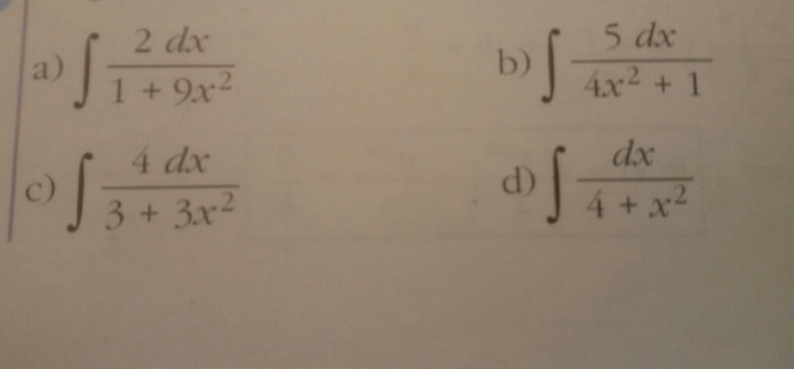 Son integrales de tipo arcotangente... Te sugiero este video, al menos.. Integrales inmediatas y definidas