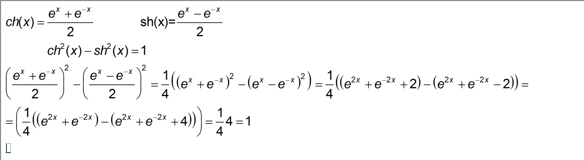 Te quedará (e^x+e^(-x))²/4 - (e^x-e^(-x))²/4 = [e^(2x)+e^(-2x) +2.e^x.e^(-x) - e^(2x)-e^(-2x)+2.e^x.e^(-x) ]/4 = 4.e^x.e^(-x)/4 =e^x.e^(-x) = e^(x-x)=e^0=1....