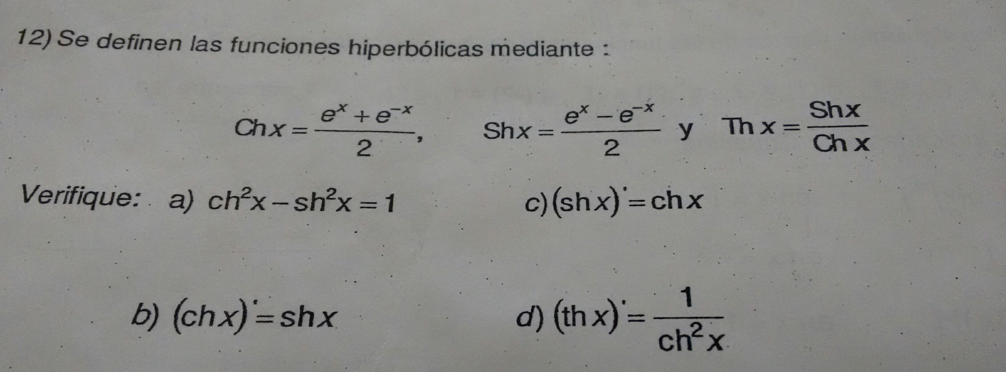Para la b) y la c) deberás derivar las expresiones (e^x+e^(-x))/2 o (e^x-e^(-x))/2 .. ¿sabes derivar bien?...