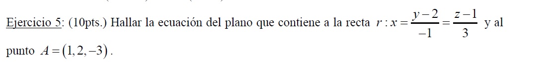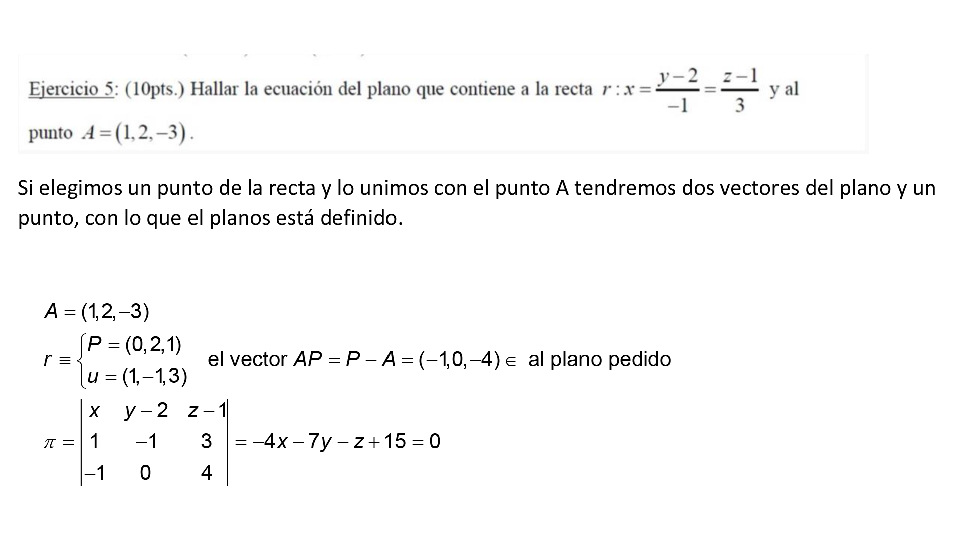 Ya tienes dos cosas. ¿Cómo hallas el vector que te falta? Te dan la recta en ecuación continua (si te la diesen en otra, bastaría con pasarla tanto a continua como a paramétrica). De la ecuación sacas un punto, en este caso B(0, 2, 1). Coges ese punto B, el punto A y haces el vector AB, por ejemplo. De esta manera ya tienes dos vectores directores del plano y un pto perteneciente al mismo.