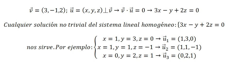Hola de nuevo, en un ejercicio me piden calcular tres vectores perpendiculares al vector v(3,-1,2). Sé que el producto escalar de cada vector que calcule con el vector v, me tiene que salir cero, pero no consigo saber cómo hallar esos vectores. Decían "a ojo" ...