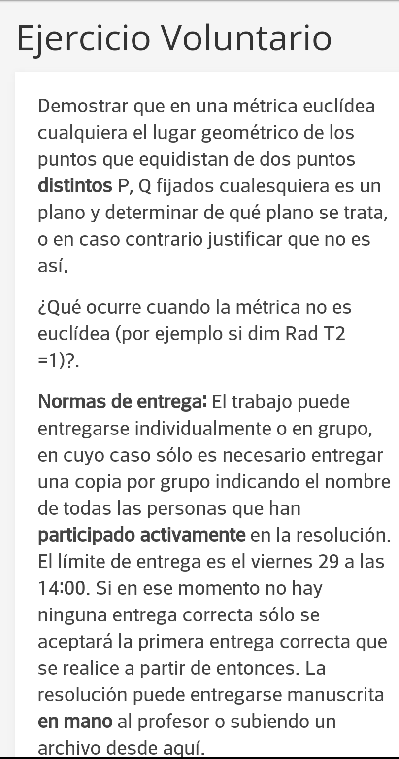 Me han pedido que demuestre en álgebra lineal y geometría que en una geometría euclídea el lugar geométrico que equidista de dos puntos es un plano, pero además que demuestre el qué pasaría si en vez de usar una métrica euclídea, usamos una métrica con un radical de dimensión 1. La verdad es que no sé muy bien por dónde empezar, ¿me podéis echar una mano?