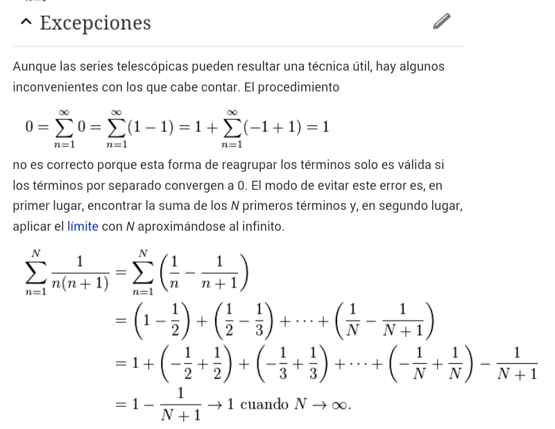 Hola maestros de unicoos, necesito que me expliquen la exepción de la serié telescópica adjunta en la imagen, y si existen otras exepciones mejor, porque las necesito saber y estudiarlas, y qquisiera que me las expliquen si ea que la haya, aunque tengan que usar multiplicatoria o productorio Π( Pi en mayúscula). Si me facilitan esa ayuda no me tendría palabras por esta enorme ayuda. Muchas gracias y saludos. ATT: Toby.