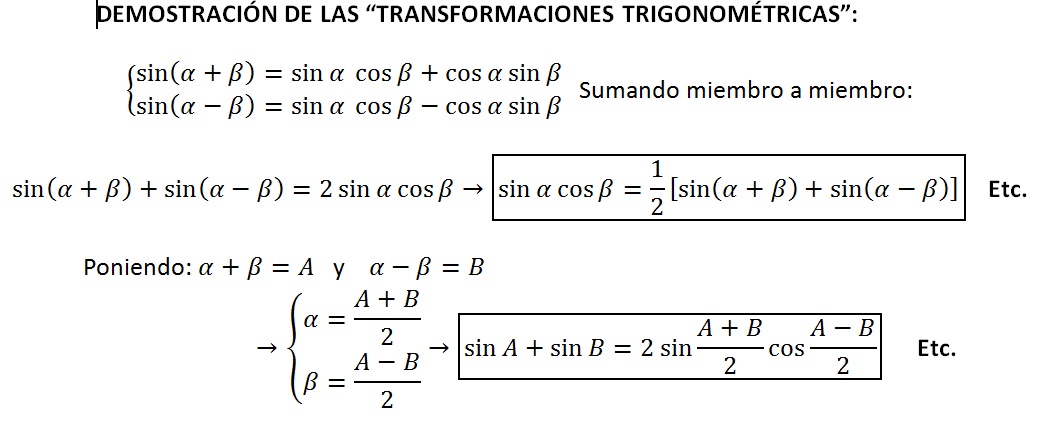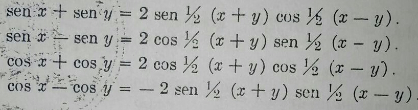 Hola a todos, buen día. Podría algun amigo puede ayudarme con las siguientes identidades trigónometricas, en sí transformación de la suma y diferencia de senos y cosenos en productos, hay que DEMOSTRAR que las siguientes identidades son válidas, si alguien me colabora con ese favor, ya aquí le estoy dando muchisimas gracias y agradeciendo de antemano. Cuidense y saludos µnicoos.