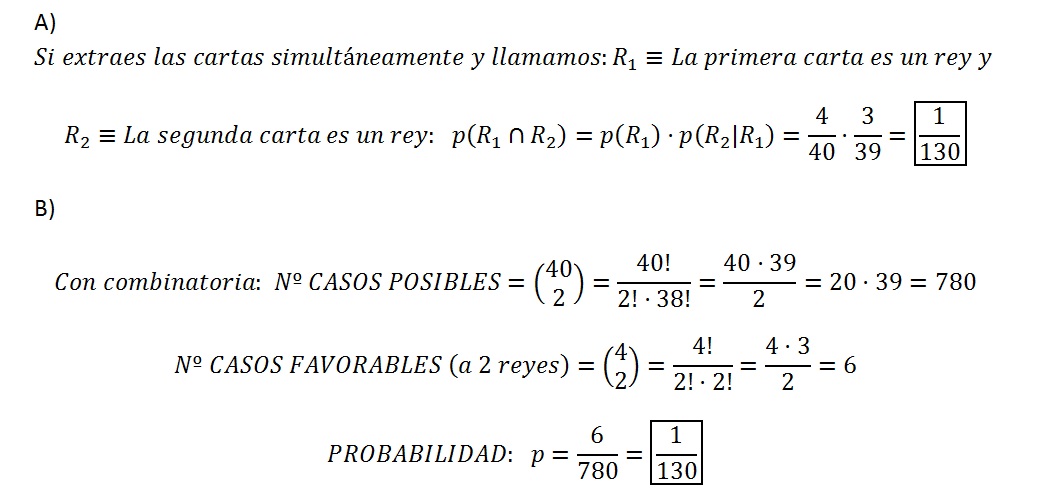 Si ahora se extraen dos cartas simultáneamente, calcula la probabilidad de que las dos sean reyes.