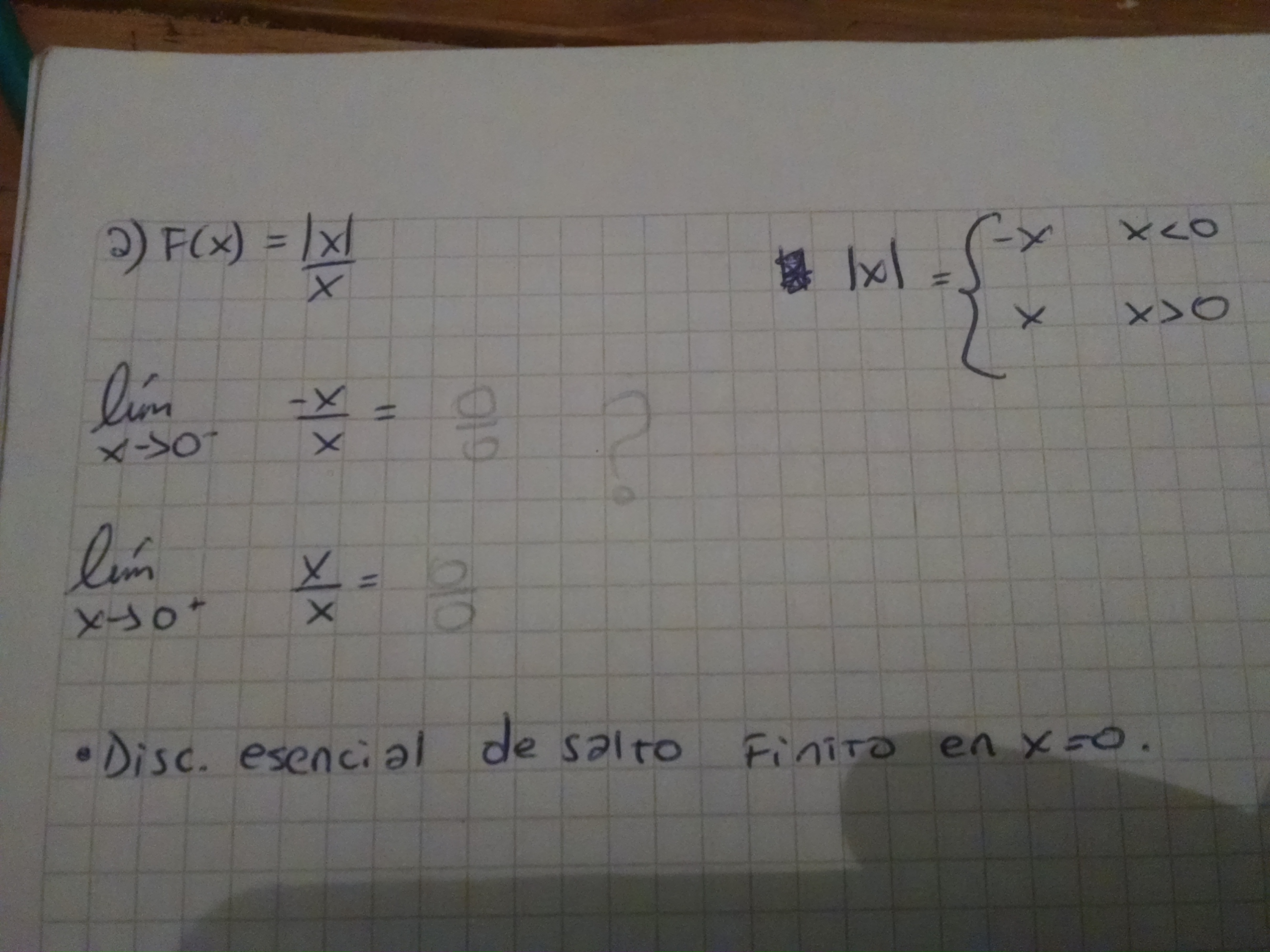 Hola me piden averiguar el tipo de discontinuidad de esta función, yo se que para hacerlo debo obtener el resultado de los límites laterales am abrir el módulo, pero como resuelvo esos límites si se que ambos me quedarían 0/0. La respuesta dice que es disc. Esencial de salto finito en x=0.