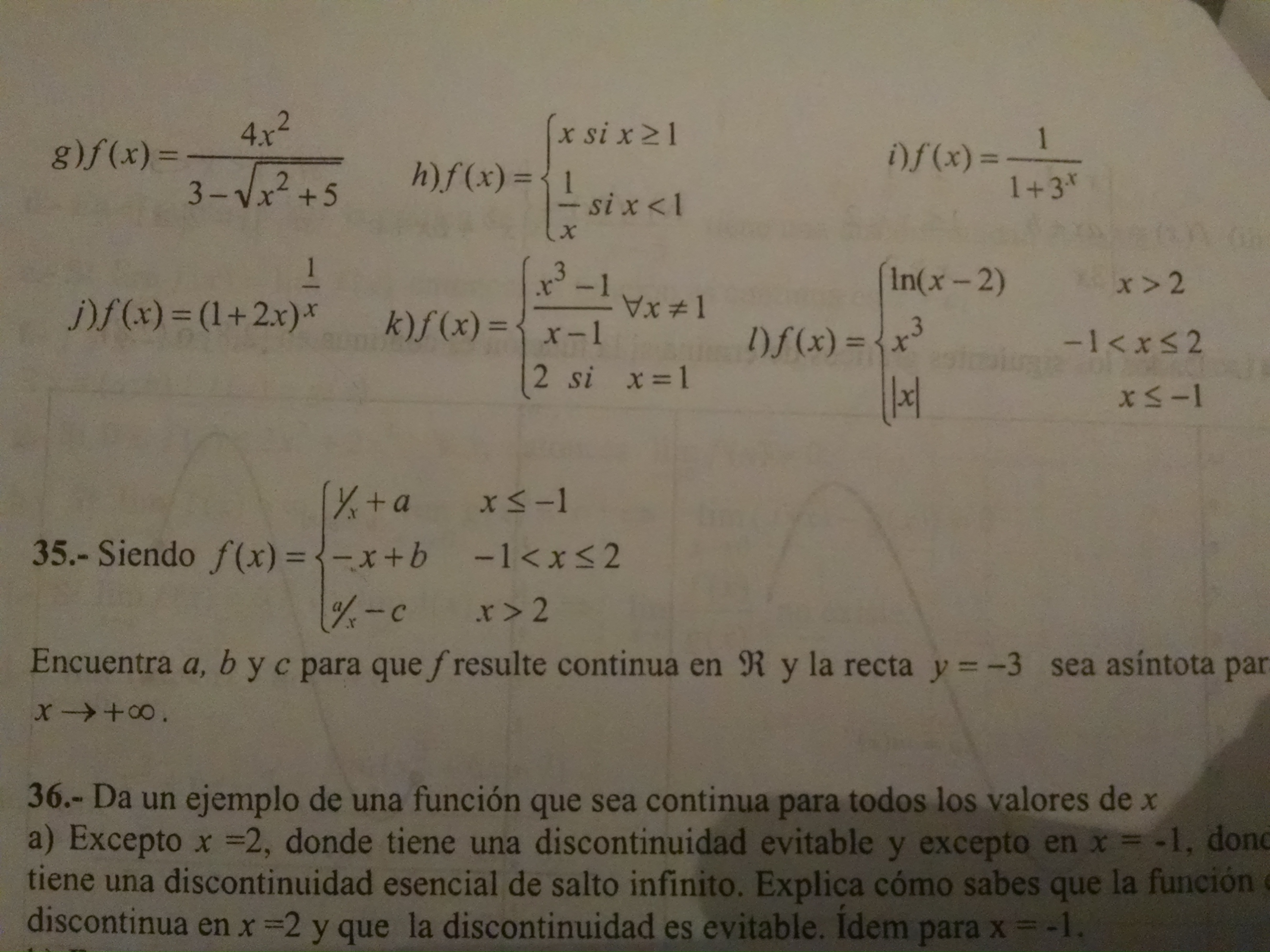 Hola necesitaría una mano tmb para el ejercicio 35, al menos como plantearlo. Para que sea una función continua tendría que hacer los límites laterales en x--> -1 y 2, igualando ambas ramas (del 1 por izquierda 1 por derecha e igual con el 2) para encontrar a,b y c estoy en lo correcto? Pero como hago para que y=3 sea asintota? Que significa para x---> + infinito.