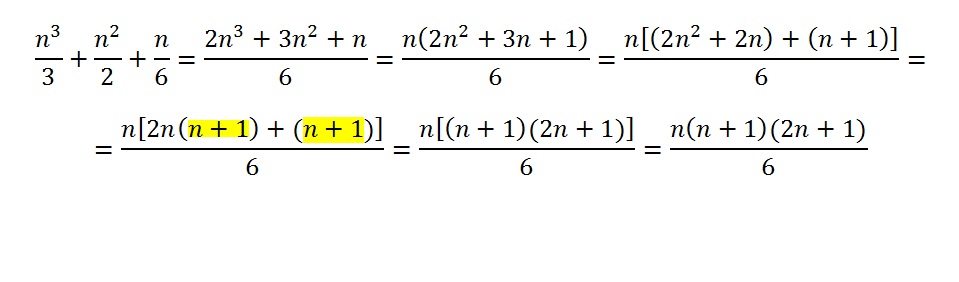 Alguien sería tan amable de decirme que cuentas se hicieron para llegar a la 2da parte, más específicamente en la parte del numerador . Estoy segura de que es una tontería pero no logro darme cuenta de como llego a n(n+1)(2n+1).