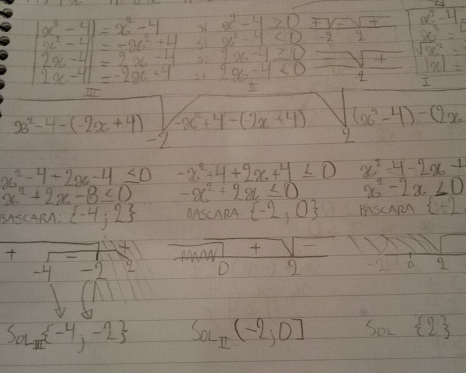 Hola, alguno me podria explicar como es que se llega a clos resultados o si esta bien, es que lo copie del pizarron y hay cosas que no entiendo como es que se llegan y creo que estan mal, la inecuacion es |x²-4|-|2x-4|≤0 que no sale en la foto, gracias