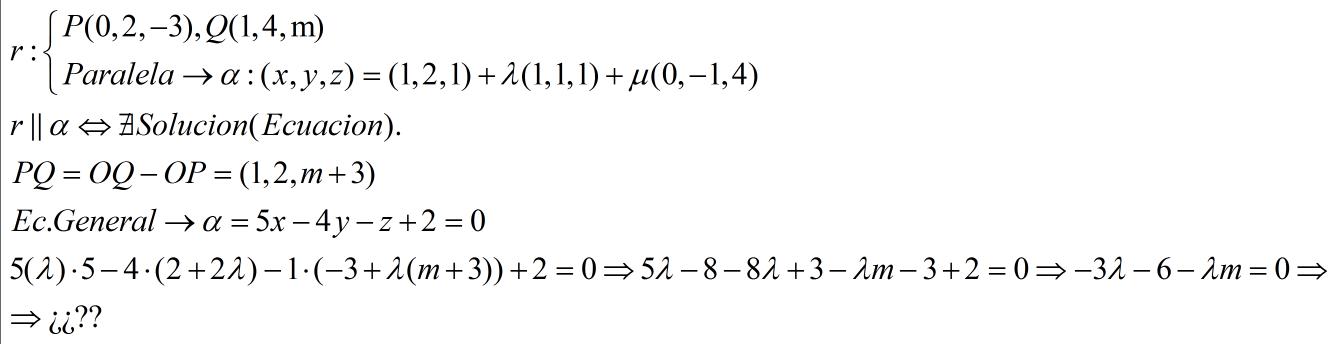 Me piden que halle m para que la recta que pasa por los puntos (0,2,-3), (1,4,m) y sea paralela al plano (x,y,z)=(1,2,1) + λ(1,1,1) + μ(0,-1,4)