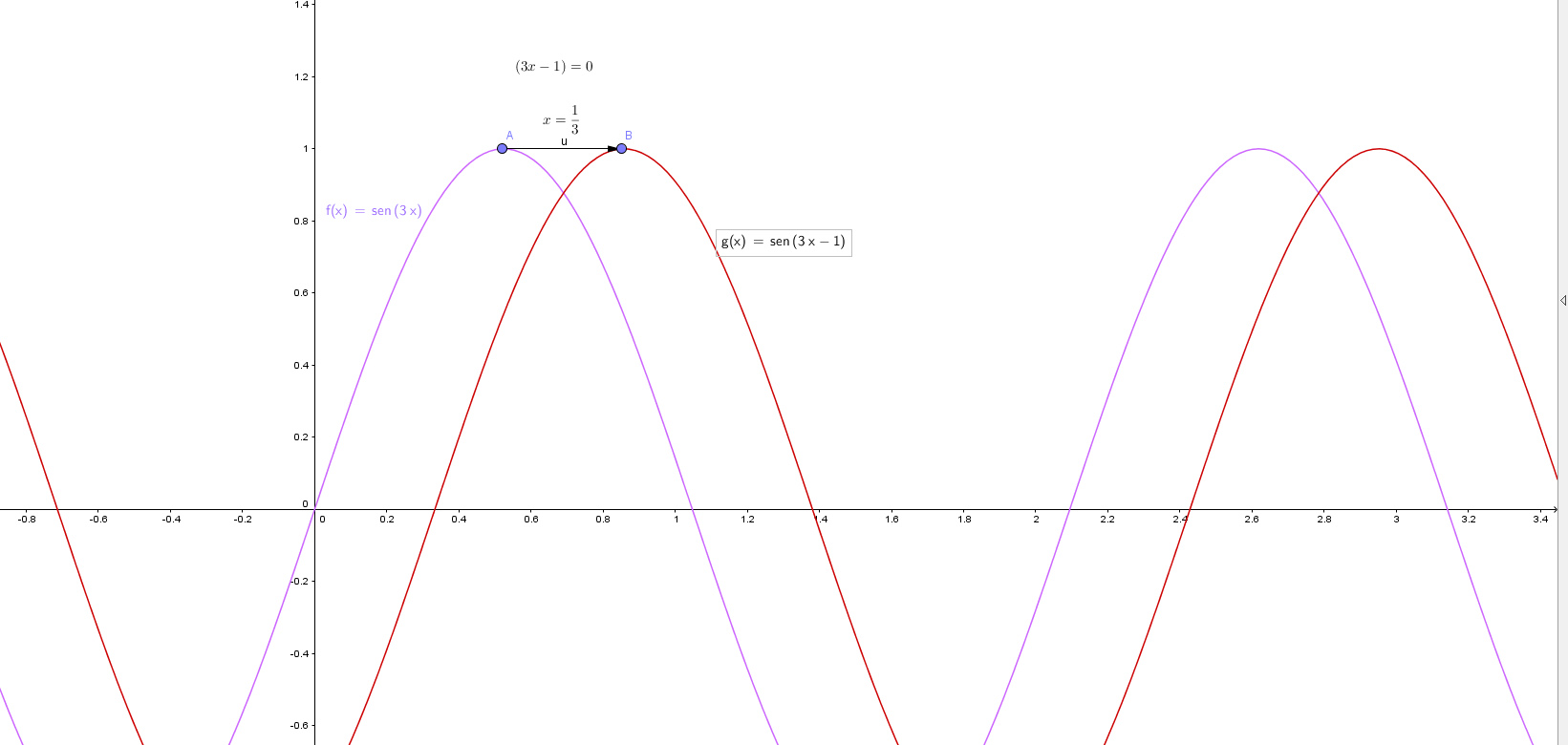 Hola amigo. Traslada esa grafica unidad a la derecha tal y cual como te han enseñado, para hallar los vertices como tu le dices, y como tu te complicas en la contraacion, temdrias que saber que toda funcion trigonometrica es periodica, en el caso de f(x)=Sen x su periodo es 2π, y en el caso de f(x)=Sen(3x-1) el periodo 2π/3 , para que hagas el esbozo lo mejor posible, iguala a 0 y resuelve como una ecuacion, la solcuion o raiz será el intercepto en el eje y, tambien dale el valor de x=0 para que puedas hallar los puntos de intercepcion con el eje x, incluso puedes hallar dos expresiones para todo los puntos máximos y mínimos. El problema es que el -1 esta en unidades centesimales , comunmente se usa radiades o los grados para facilitar el trabajo pero tambn se puede así ahi tienes que cambiar el modo a tu calcu cuando la uses. Vale. Espero haber ayudado en algo. Cdt bye.