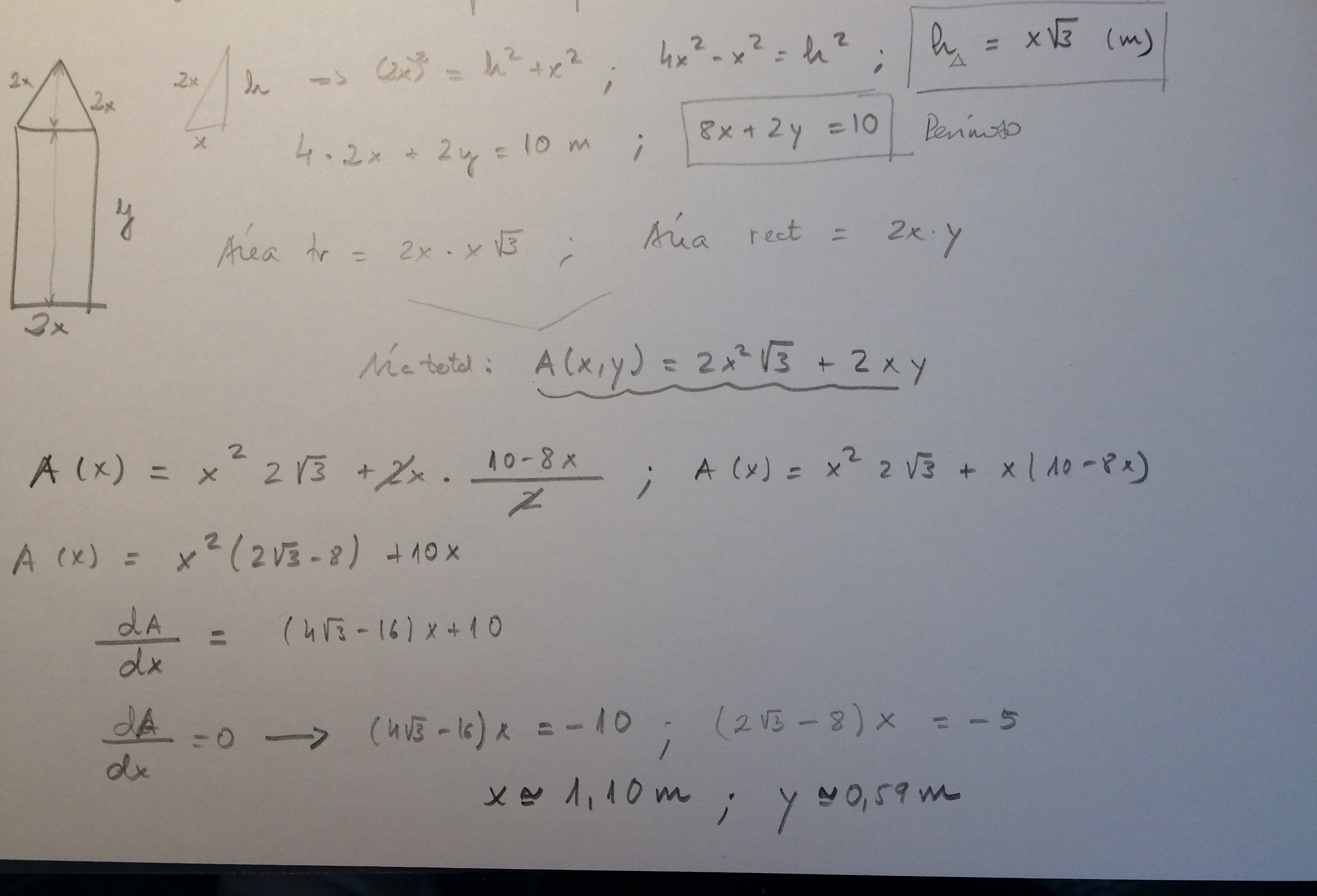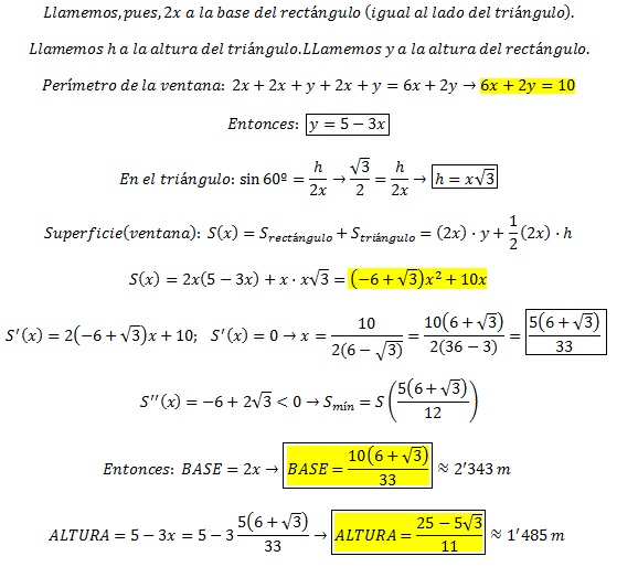 Problema de optimización: Se quiere construir, con unas finas láminas de metal, una ventana para formar una vidriera, pero con un diseño especial. La ventana que se ha diseñado está formada por un rectángulo, con un triángulo equilátero sobre él. Se dispone de 10 metros de metal para hacer el perímetro de la ventana ¿cuáles serán las medidas de la ventana para que el área encerrada sea máxima?