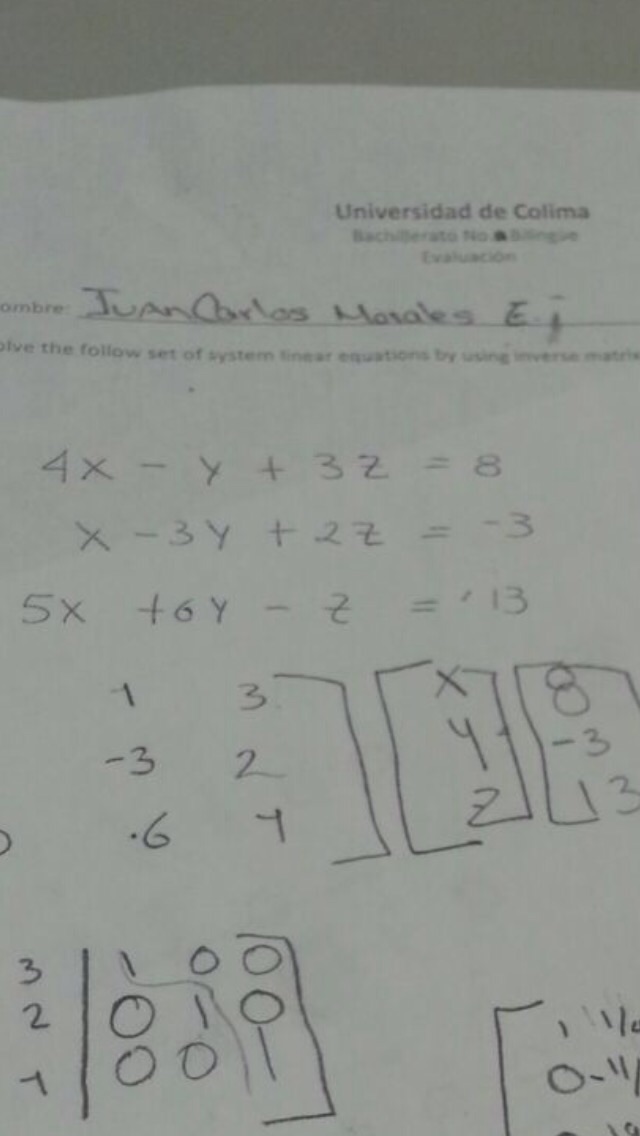 ¿la inversa de que matriz? ¿la de los coeficientes x,y,z?... el trabajo duro tiene que ser el tuyo.. intentalo y nos envias que obtuviste paso a paso...