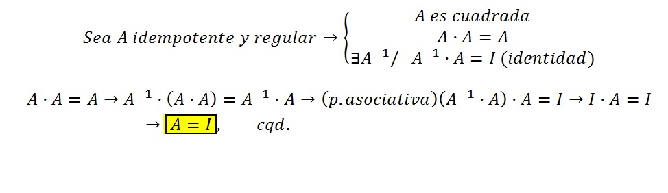 Hola a todos, me podrian ayudar con este ejercicio? ME dicee "Demostrar que las unicas matrices idempotentes y regulares son las matrices identidad". Como demuestro esto? yo lo demostre agarrando una matriz de 2x2 con la diagonal principal 1 y los otros les puse a y b, esta bien asi? Porque no se como hacerlo mas general, porque asi creo que estoy dando solo un caso que son las 2x2.. Gracias y saludos!