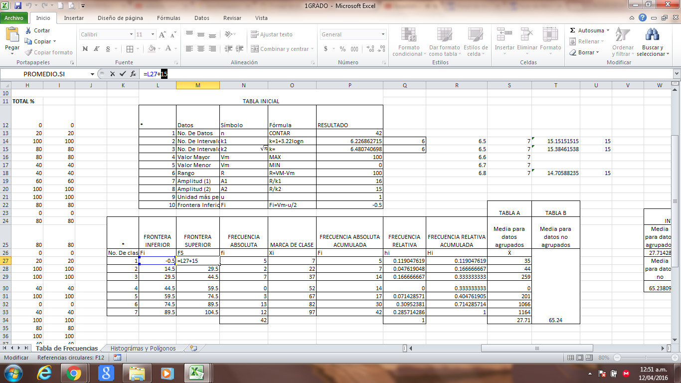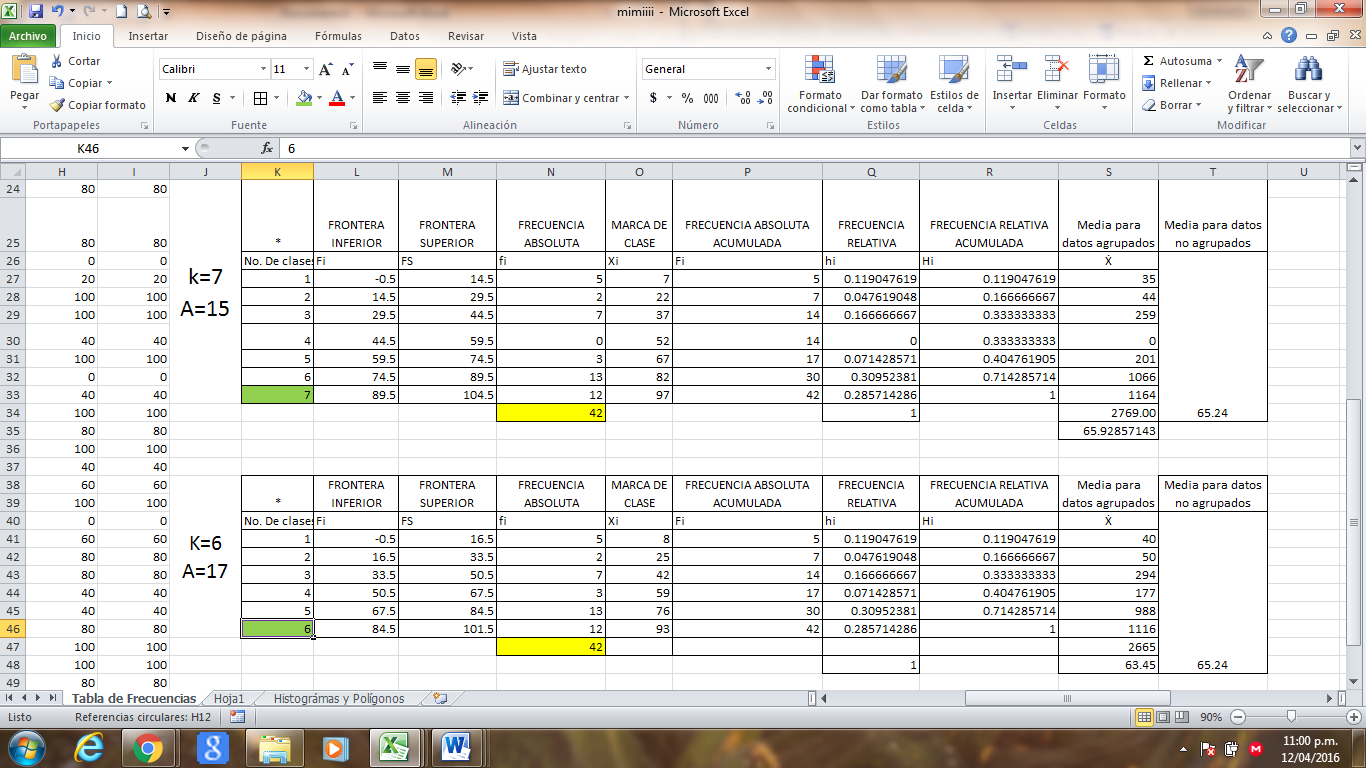 Hola espero poderme expresar de la mejor manera y así se puedan apoyarme con mayor eficacia, en la imagen se muestra que tengo de No. De intervalos (6) y de amplitud (15 o 16) (dependiendo lafórmula), ahora, como con 6 intervalos no me sale correctamente la sumatoria de mi frecuencia porque me faltarían 12, lo que hago es modificarlo a 6.5 (o también puede ser 6.6, o 6.7, según yo) de intervalo, este sube a 7 intervalos y mi amplitud no cambia. Ahí fue como ya resulto correcto la suma de mis frecuencias. Mis dudas son: