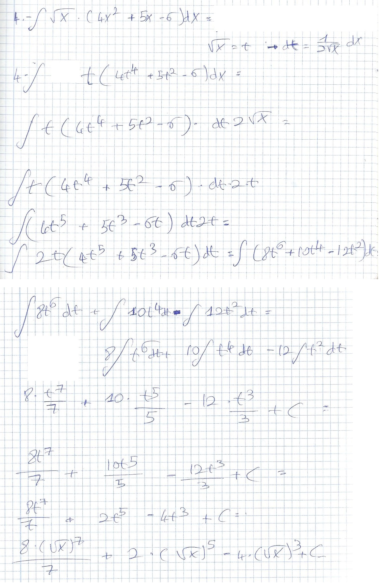 Hoola! ¿Dónde aprecian el error en esta integral que intenté hacer por cambio de variable? Seguro que está mal, pero no veo el error. Por si no se ve muy bien, el enunciado es ∫√x . (4x²+5x-6) dx.