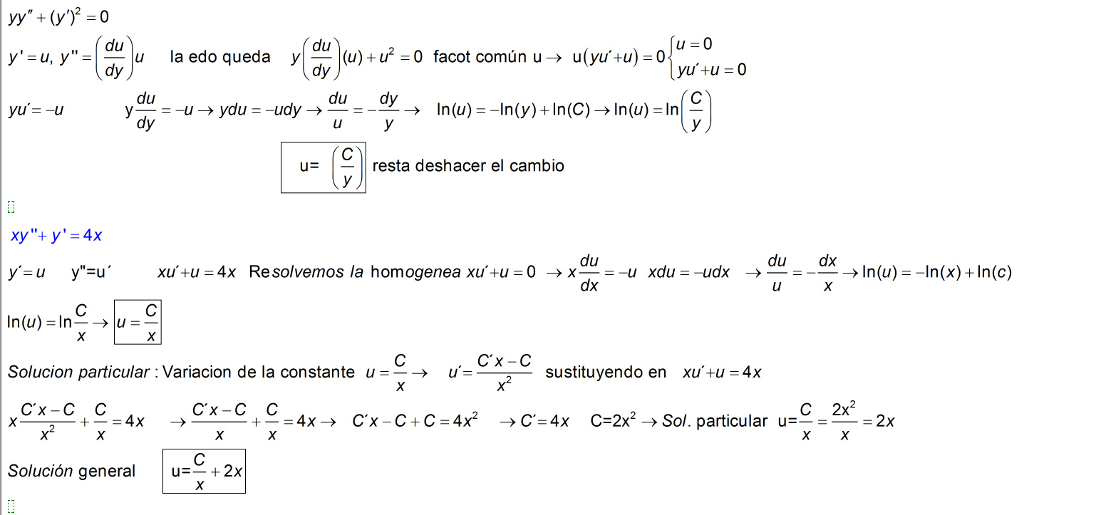 a) yy''+(y')^2=0 **En esta la debo resolver por el metodo donde no aparece x , y creeo la sustituciones son las siguientes: y'=u, y''=(du/dy) u