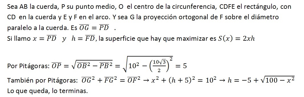 Se considera un arco de circunferencia de 10 cm de radio y distancia cordal 10√3 cm. Inscribir dentro del arco un rectángulo de área máxima.
