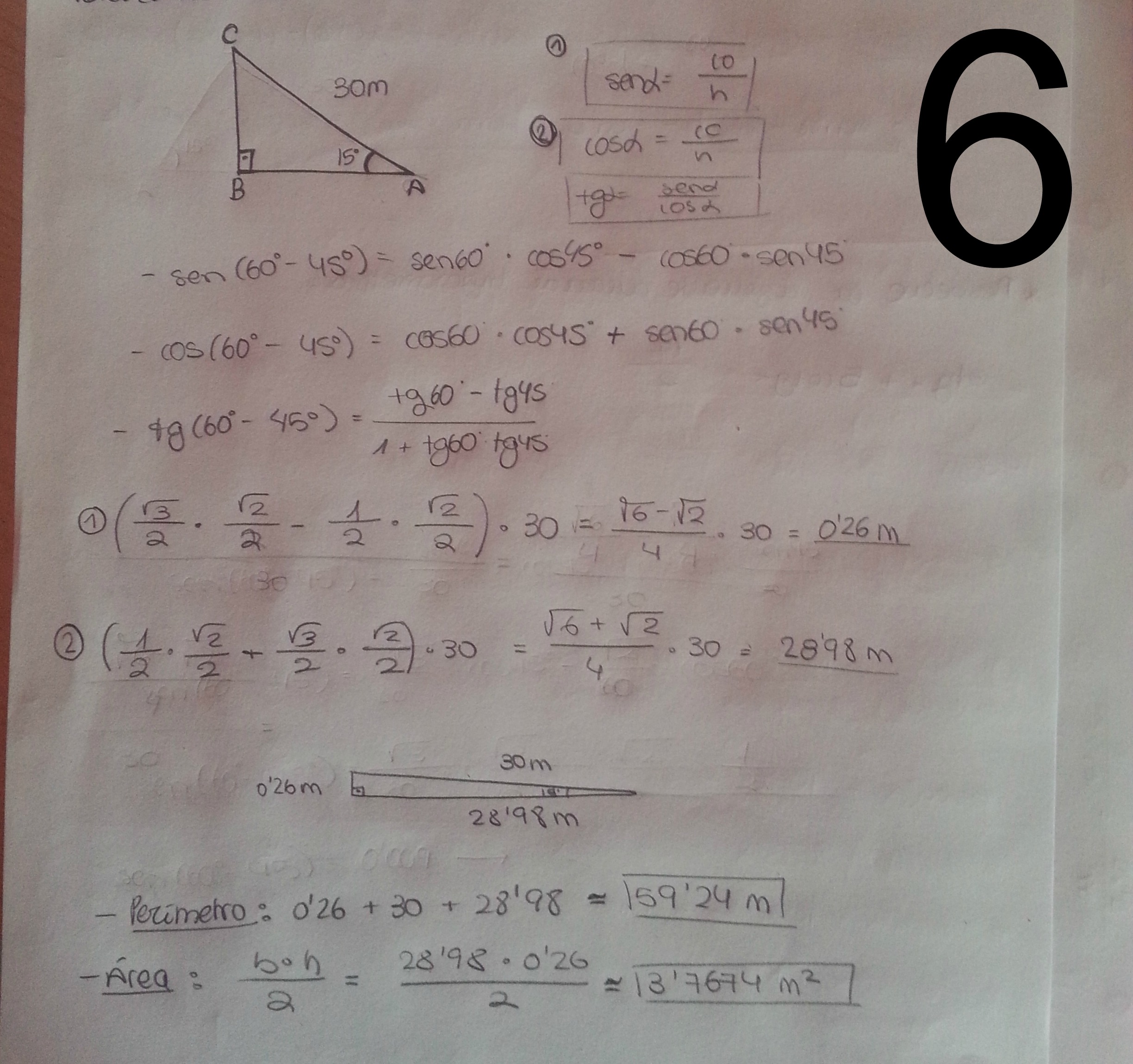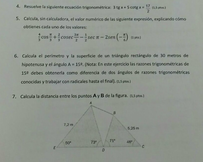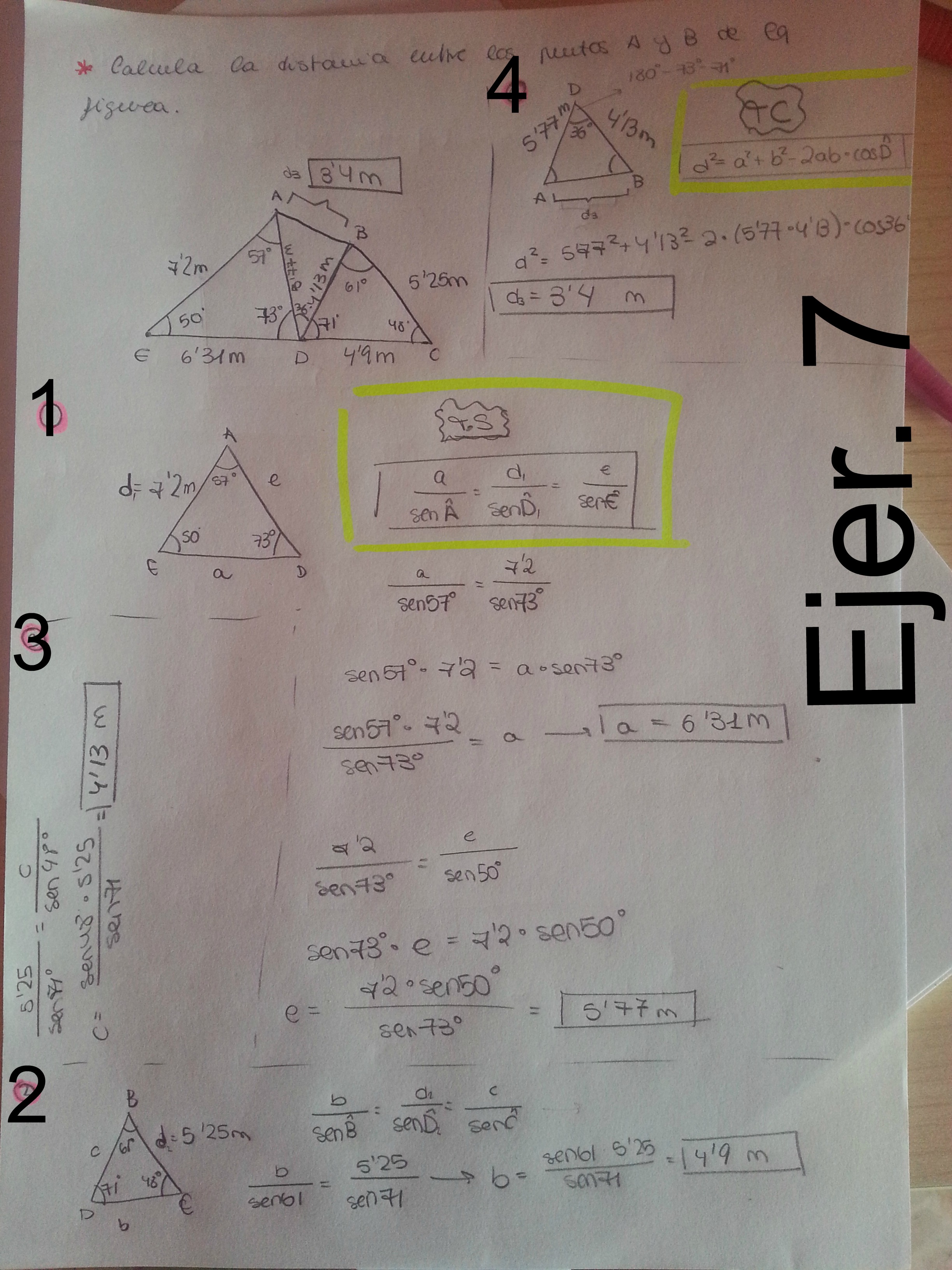 Aquí el ejer. 7. En los dos triángulos he calculado los ángulos que faltaban restando los que me dan a 180º. Con el TSen he hallado los lados de cada triángulo que me faltaba y después en el último triángulo, he hallado el ángulo que forma a los dos lados sumando 73º + 71º que son los ángulos de los otros dos triángulos, y cuando he obtenido el ángulo (36º) con el TCos he hallado la distancia de A a B que era lo que me pedían. Mi duda es si he hecho bien el paso 4. Gracias. Por si no veis bien el enunciado, os he dejado la fotocopia del examen en mi primer comentario. Muchas gracias.
