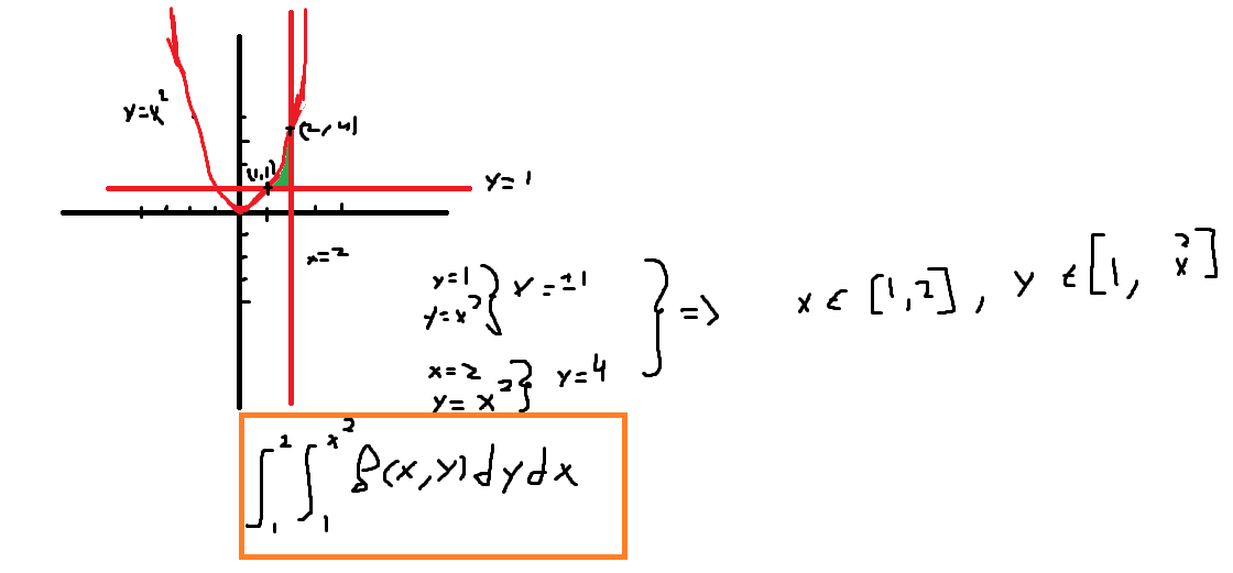 Acabo de empezar con las integrales dobles y se me pide la integral que habría que calcular para sacar el área delimitada por estas funciones: y=1, x=2 y y=x^2.