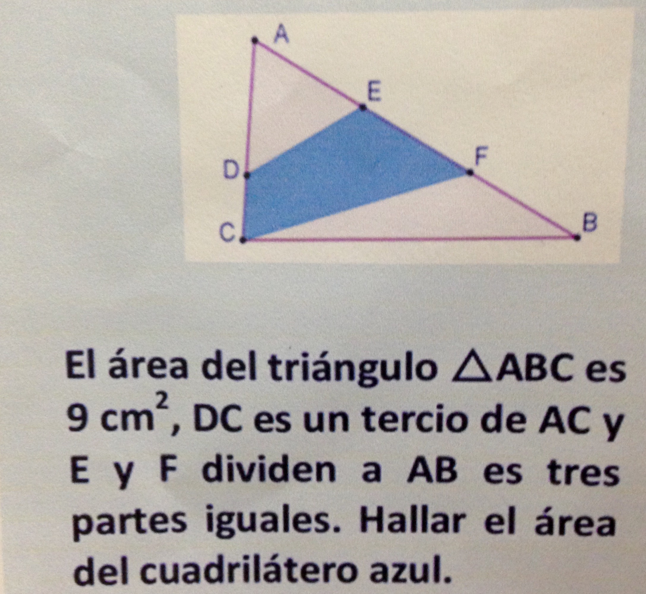 El área del triángulo es CB·CA/2. Si dividimos la altura del triángulo entre tres (CA/3) y como los segmentos EF y DC son proporcionales, quiere decir que al dividir la altura por tres para esa misma base AB, el área del cuadrilátero señalado es 1/3 del area total, es decir 9m³/3=3m³