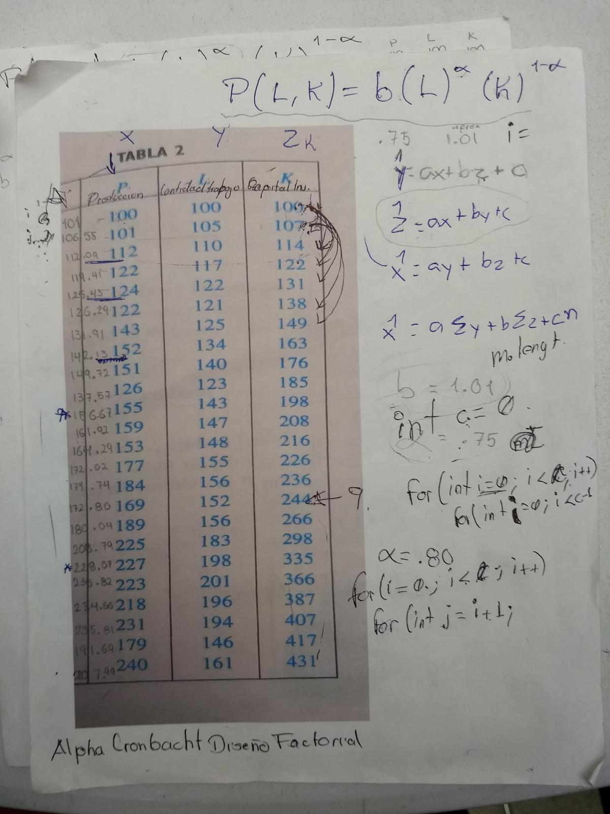 Hola tengo esta tabla con datos, y la fórmula para calcularlos es P(L,K)=b(L)^alpha*(k)^1-alpha como se muestra en la imagen, mi pregunta es cómo podría alpha y b a partir de los datos que me han dado ![]()
