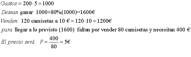 Unos alumnos de 4º de la ESO venden camisetas para recoger fondos para el viaje de fin de curso. Han comprado 200, a 5 € la unidad, y quieren ganar al menos el 80% del precio de coste. Si han vendido las 120 primeras en 10 €, a cuánto deben vender, como mínimo, las restantes?