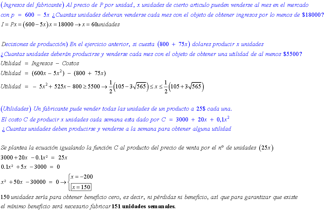 2.(Utilidades) Un fabricante pude vender todas las unidades de un producto a 25$ cada una. El costo C de producir x unidades cada semana esta dado por C = 3000 + 20x + 0,1x2 ¿Cuantas unidades deben producirse y venderse a la semana para obtener alguna utilidad?