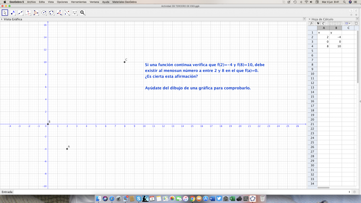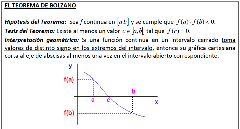 "Si una función continua verifica que f(2) = -4 y f(8) = 10, debe existir al menos un número a entre 2 y 8 en el que f(a) = 0.