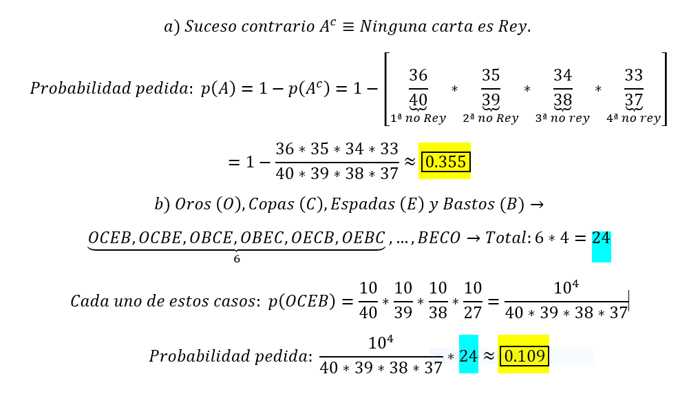 Elegimos aleatoriamente 4 de las 40 cartas de una baraja española. Calcular la probabilidad de que: