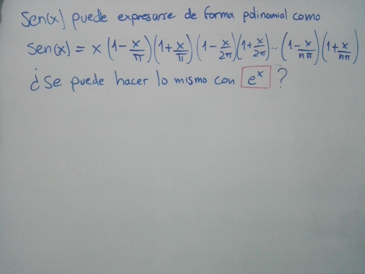 En un en un video reciente del canal Flammable Maths se muestra una resolución al problema de Basilea. Comenzando la explicación hablando de seno de X escrito de manera polinomial (como escribo en la foto) Mi pregunta es ¿se podrá escribir otras funciones también de esta manera como e elevado a la x?