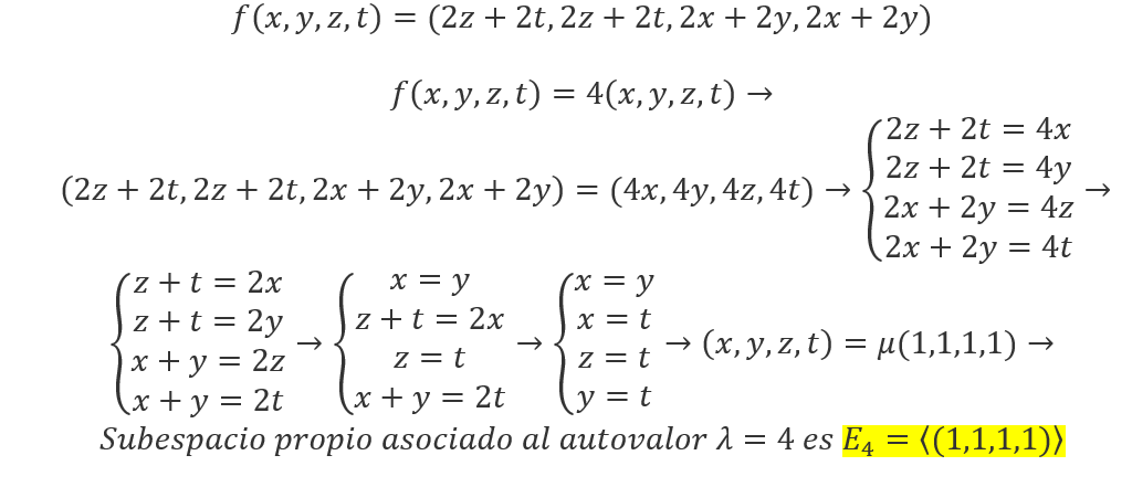 Sea f:R4->R4 la aplicación lineal definida por f(x,y,z,t)=(2z+2t,2z+2t,2x+2y.2x+2y), encontrar los vectores propios de f de valor propio 4.