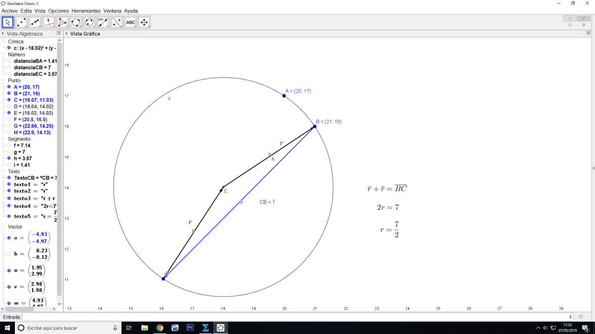 Los puntos 𝐴, 𝐵 y 𝐶 son tres puntos distintos de una circunferencia. Las coordenadas de 𝐴 y 𝐵 son (20, 17) y (21, 16) respectivamente. El segmento 𝐴𝐶 es un diámetro de la circunferencia. La distancia entre 𝐵 y 𝐶 mide 7 𝑢. La longitud del radio de la circunferencia, en 𝑢, es: