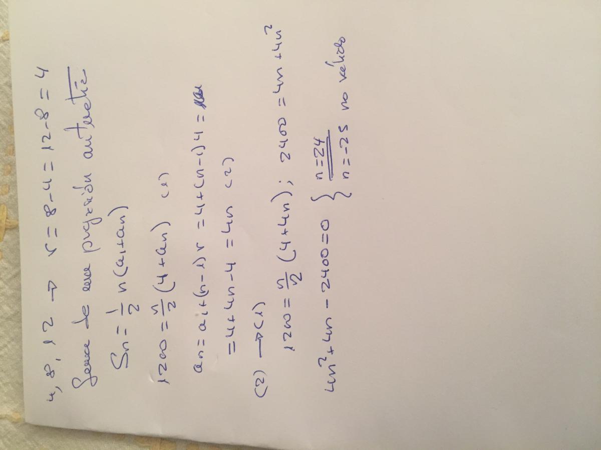 alguien me ayuda??? ``¿cuantos términos de la progresión aritmética 4;8;12;.... hay que tener para que su suma sea 1200?´´ ...... no tengo ni idea de como hacer este ejercicio y necesito ayuda porque estoy estudiando para mi examen de mañana.... AUXILIO .... de antemano: GRACIAS!!