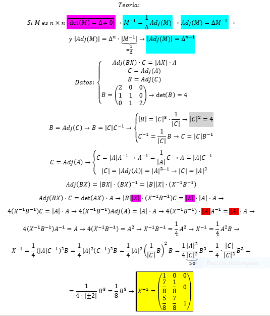 Aclara qué entiendes por Adj(M), si la matriz de adjuntos o la matriz traspuesta de adjuntos.
