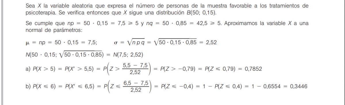 Actividad 8: Después de realizar varios sondeos sobre una población con problemas socioeconómicos, se ha conseguido averiguar que únicamente un 15% de la misma es favorable a los tratamientos de psicoterapia. Elegida una muestra de 50 personas de dicha población, calcula:
