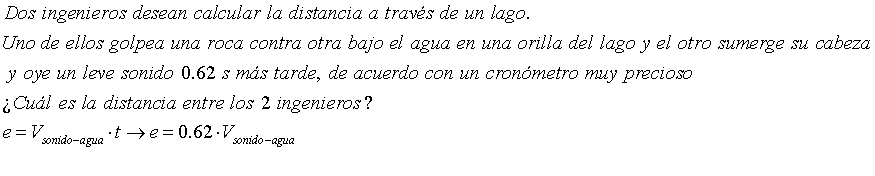 Dos ingenieros desean calcular la distancia a través de un lago. Uno de ellos golpea una roca contra otra bajo el agua en una orilla del lago y el otro sumerge su cabeza y oye un leve sonido 0.62 s más tarde, de acuerdo con un cronómetro muy precioso ¿Cuál es la distancia entre los 2 ingenieros?