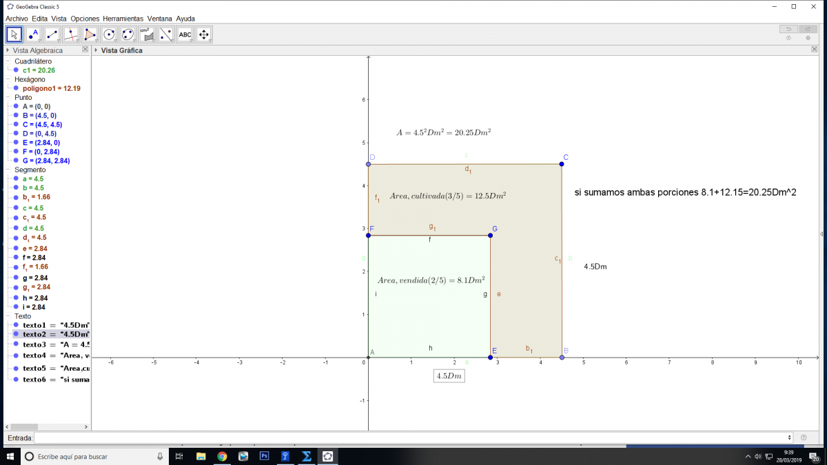 de una extensión cuadrada de 4.5 decámetros de lado se venden 2/5 y lo restante se cultiva ¿Cuántas áreas tiene la porción cultivada?