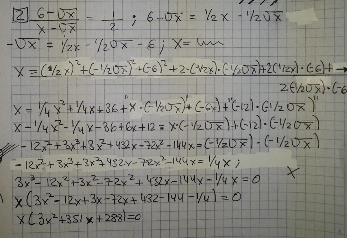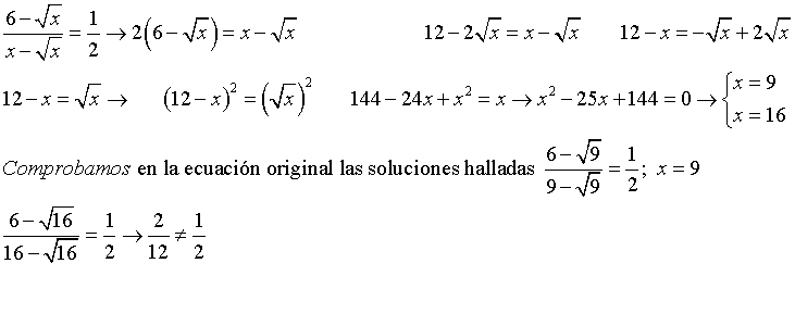 ( 6-√(x) ) / ( x-√(x) ) = 1/2, en la cuál x debe tomar valores estrictamente positivos y distintos de uno.