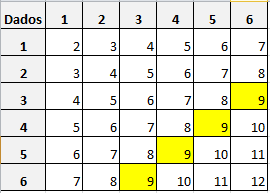 Hola!! tengo esta duda en probabilidad, en la ley de laplace: "en el lanzamiento de dos daddos, calcula P(A) si A es: suma de caras igual a 9. ".