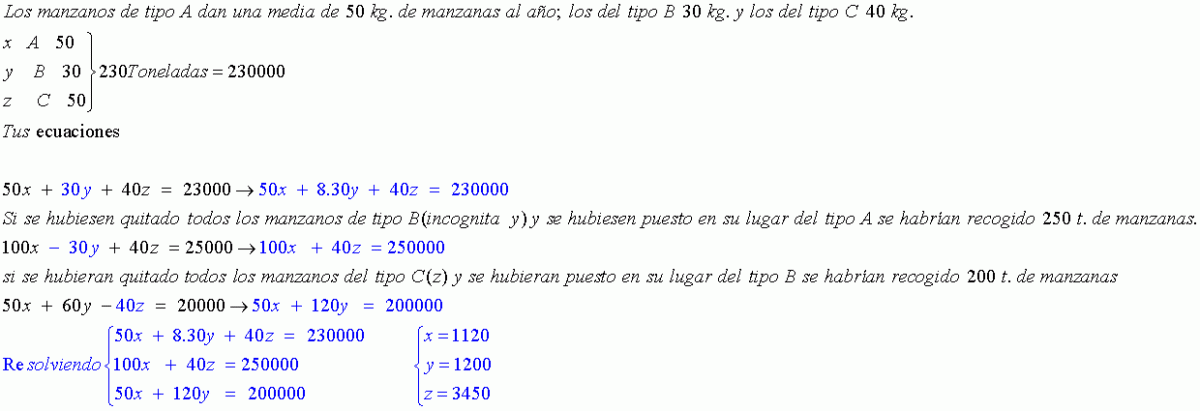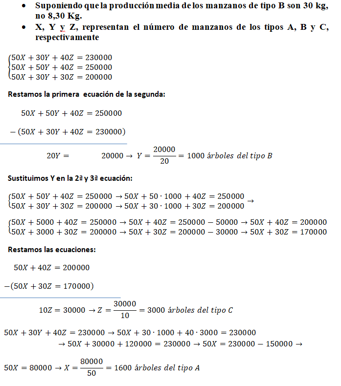 Un agricultor tiene plantados tres tipos de manzanos, A, B y C. Los manzanos de tipo A dan una media de 50 kg. de manzanas al año; los del tipo B 8,30 kg. y los del tipo C 40 kg.