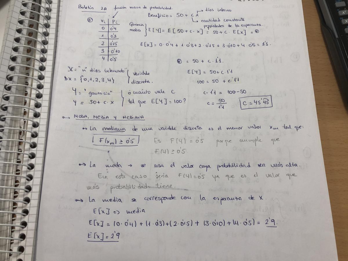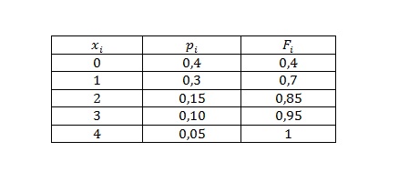 Y la media sería: E[x] = 0 · 0,4 + 1 · 0,3 + 2 · 0,15 + 3 · 0,10 + 4 · 0,05 = 1,1