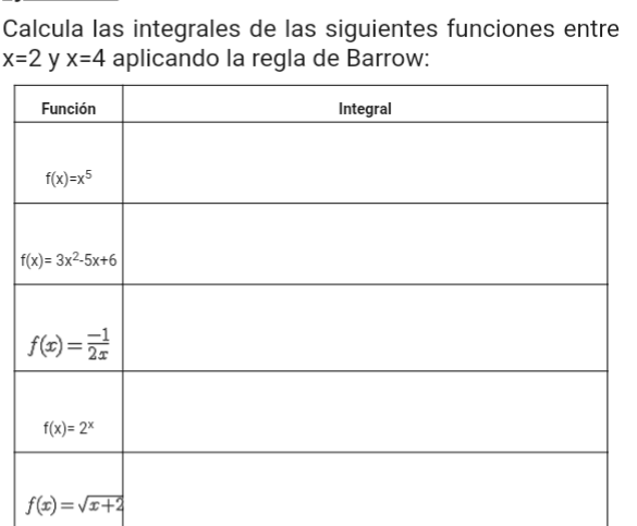 = 3*[ x3/3 ] - 5*[ x2/2 ] + 6*[ x ] = evalúas:
