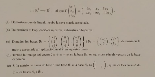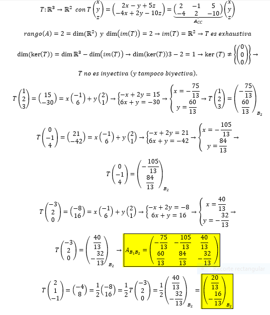 c) Dadas las bases ... determinar la matriz asociada y la aplicación linea T en estas bases.