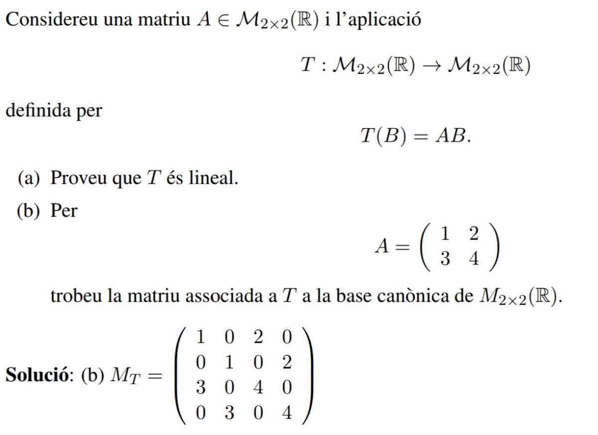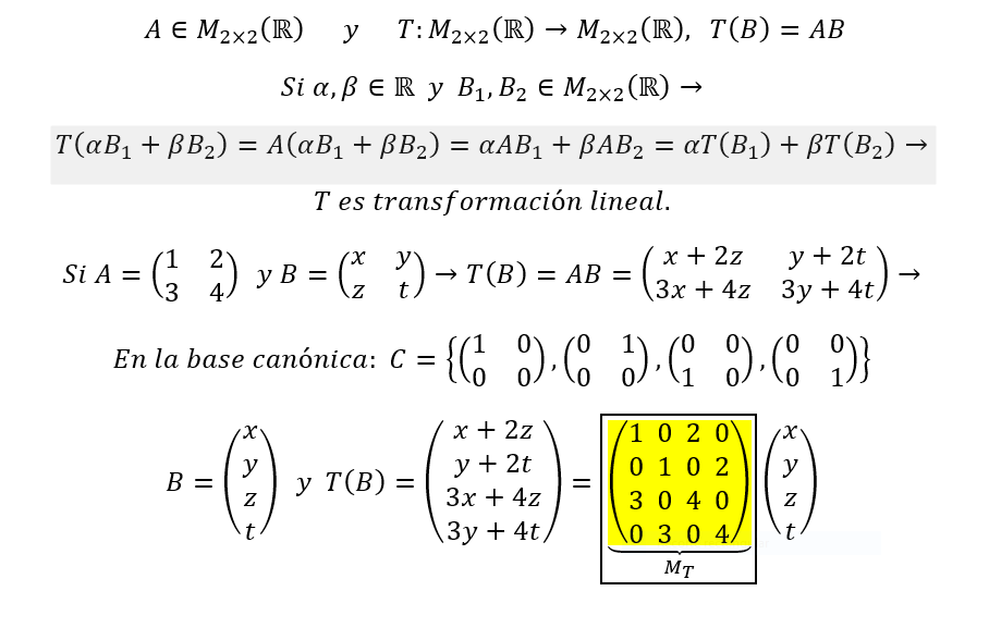 Considerar una matriz A perteneciente a M2x2(R) y la aplicación T: M2x2(R) →M2x2(R) definida por T(B) = AB