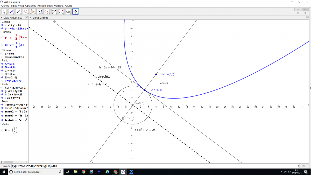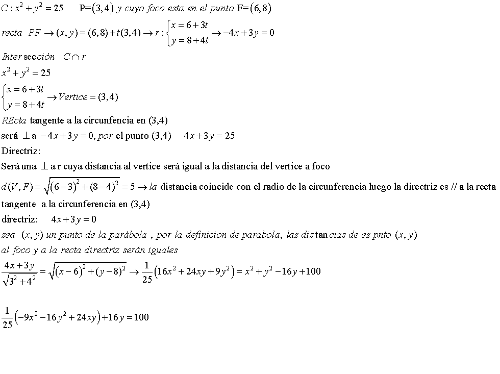 Hallar la ecuación de la parábola tangente a la circunferencia x^2+y^2=5 en el punto (3,4) y cuyo foco esta en el punto (6,8)