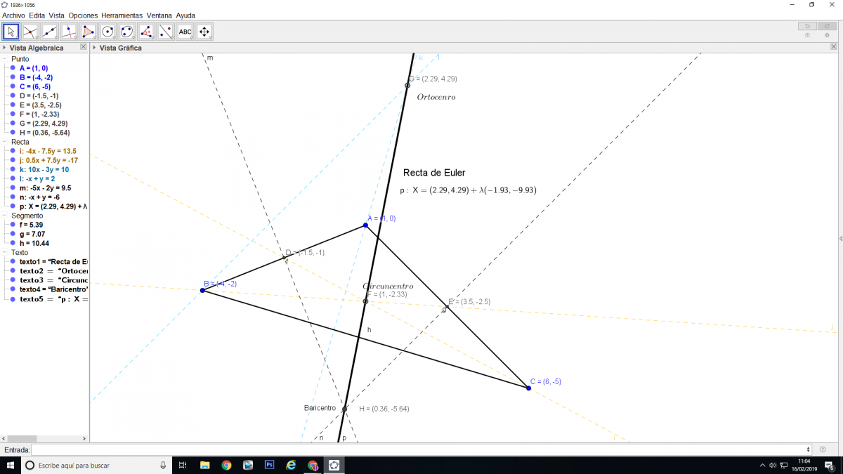 Después comprueba que el baricentro, el circumcentro y el ortocentro estan alineados.