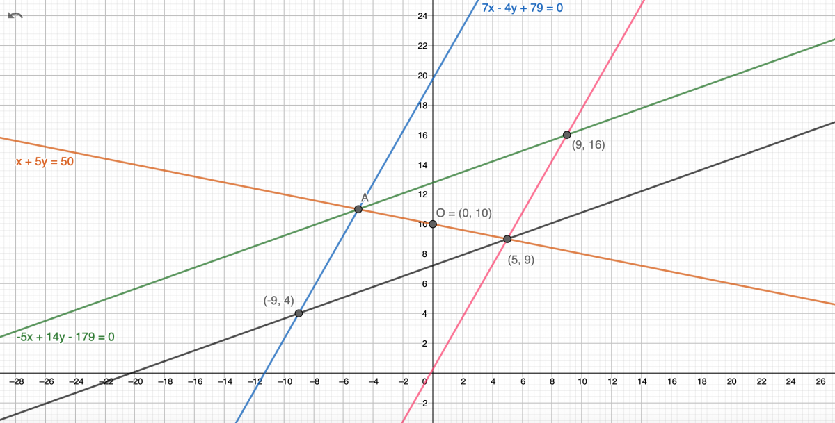 Dos lados r: -5x + 14y- 179=0, s: 7x - 4y + 79=0 y una diagonal t: x+ 5y=50 parten de un mismo vértice de un paralelogramo. El punto de intersección de las diagonales está en el eje OY. Encuentra los vértices y las ecuaciones de los otros lados